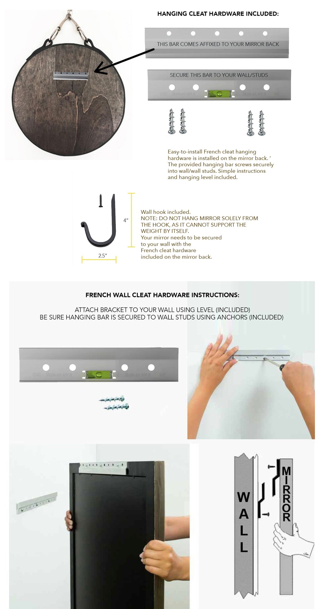 - Hanging wall hook included. NOTE, the hook is purely for aesthetics. DO NOT HANG MIRROR SOLELY FROM THE HOOK, AS IT CANNOT SUPPORT THE WEIGHT BY ITSELF. Your mirror needs to be secured to your wall with the French cleat hardware included on the mirror back.
