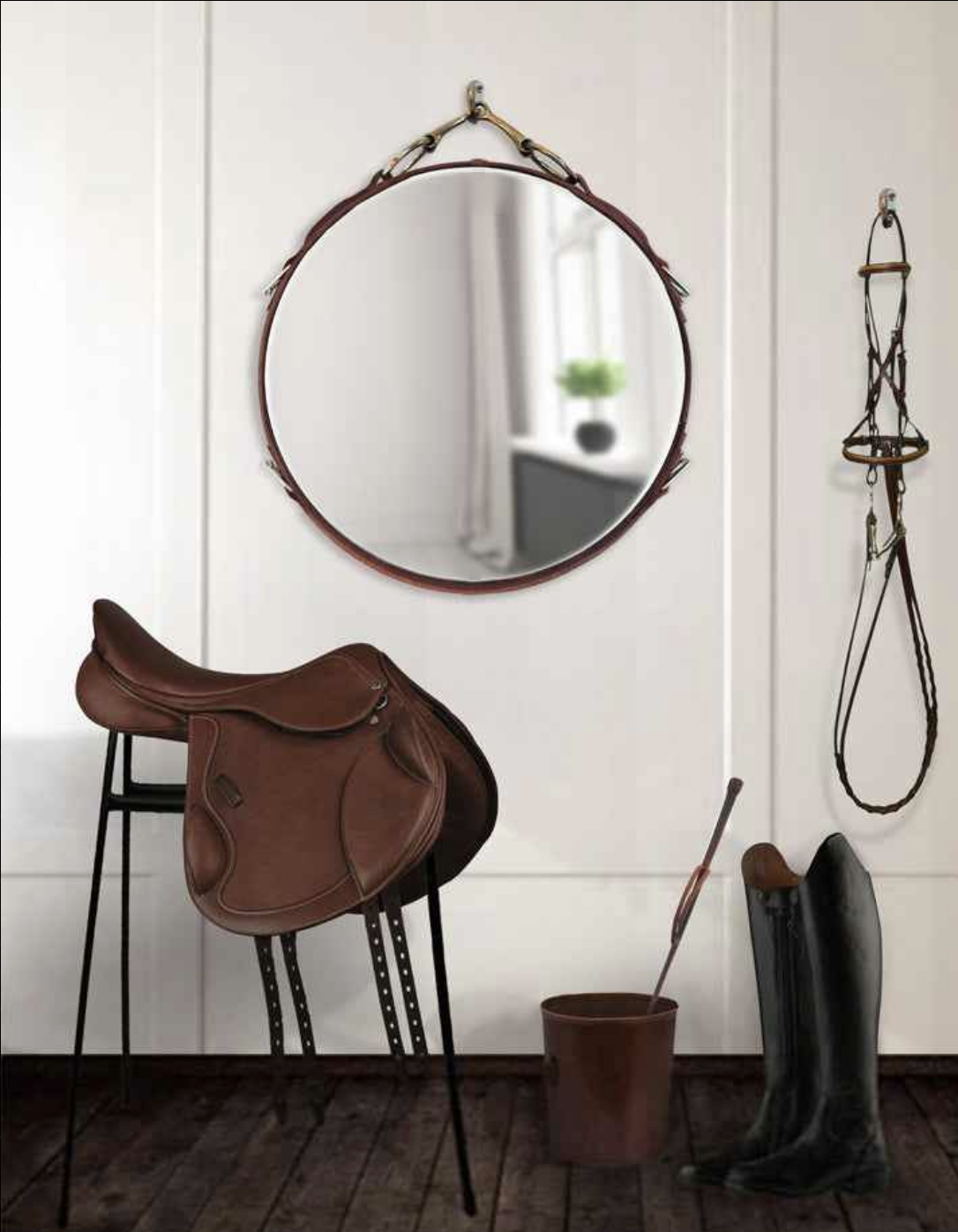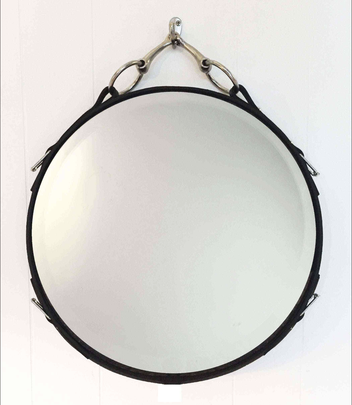 Our classic Leather-Framed Equestrian Mirror, in a larger 30" (diameter) size. Features hand-tacked buffalo leather in black, brown or mahogany, and is detailed with a genuine nickel-finish snaffle bit at the top and with matching buckles and raised silver button tacks.