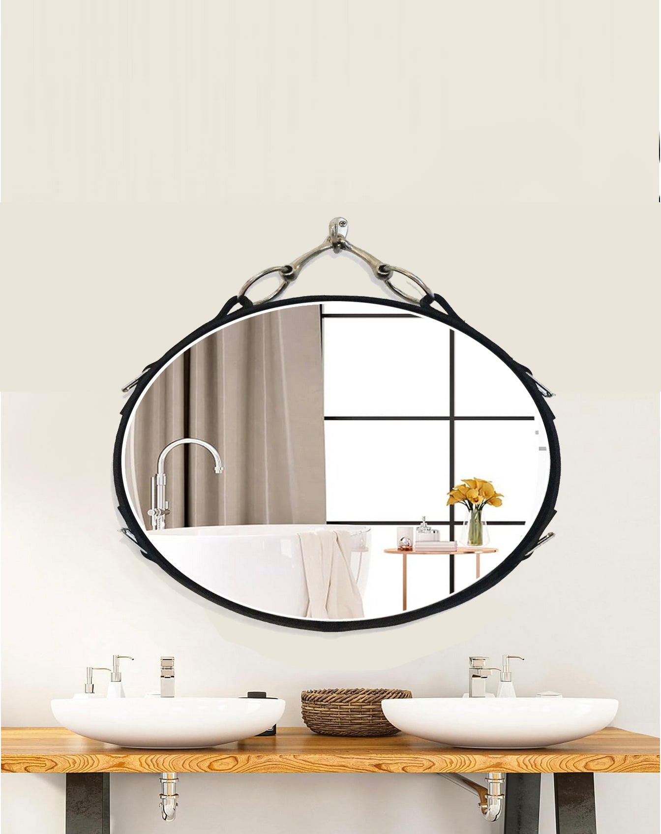 Hand-tacked Latigo buffalo leather around a high quality, beveled oval mirror. The mirror is embellished with a genuine nickel-finish snaffle bit faux-hanger, and matching sleek buckles and raised silver button tacks on either side. French cleat hanging hardware installed on the back of the mirror secures it to your wall.